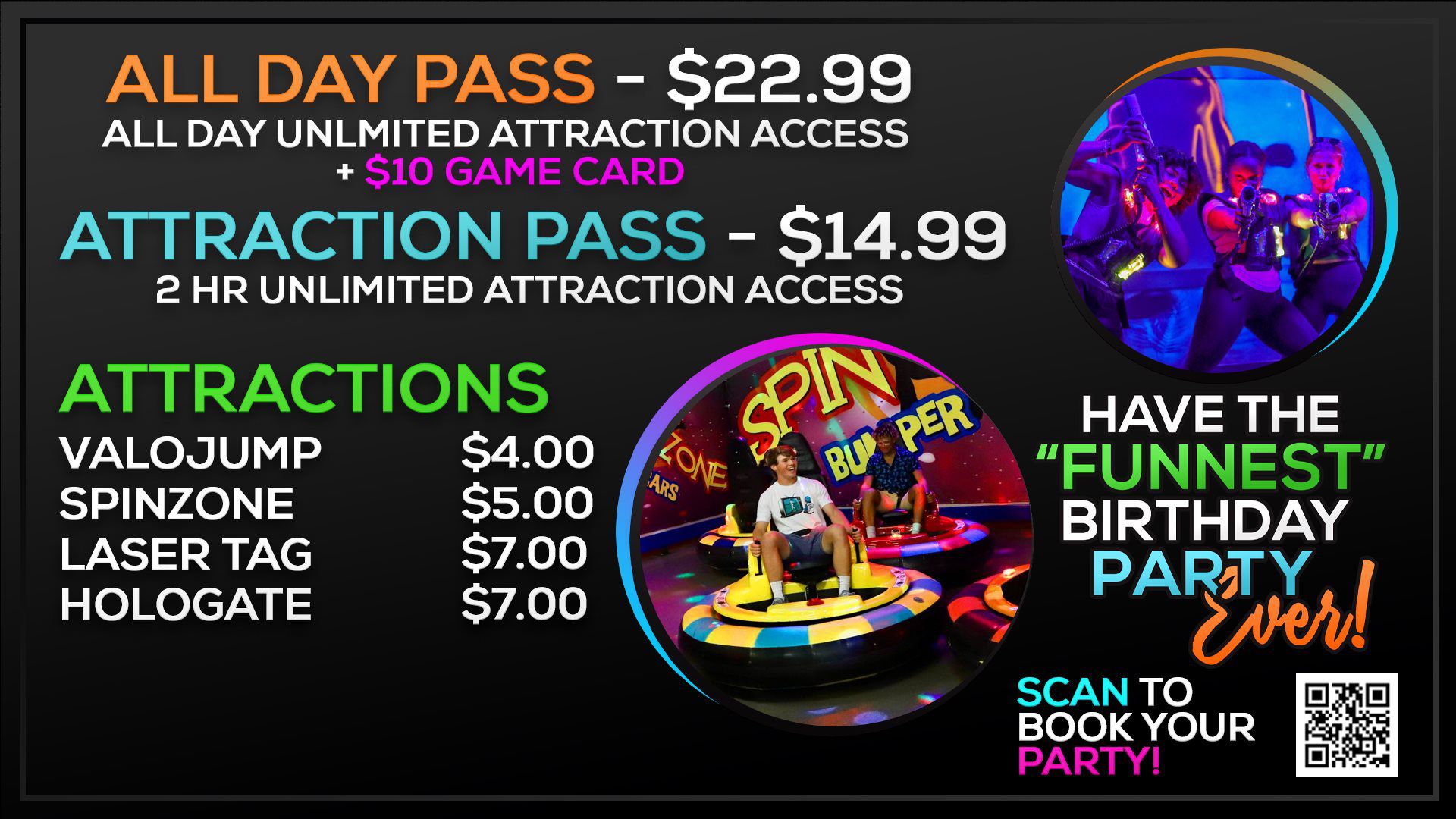 Fort Frenzy is a pay-to-play facility, meaning there’s no entry fee—just come on in, explore, and choose how you want to have FUN! Want unlimited access to all the attractions? Grab a 2-Hour or All Day Pass! The All Day Pass even comes with gameplay value to level up the fun at the arcade. Or, if you're all about the arcade, you can load up on gameplay for arcade games and pay-per-swipe attractions separately. You can even add more gameplay to your card as you go. The fun is totally up to you!
